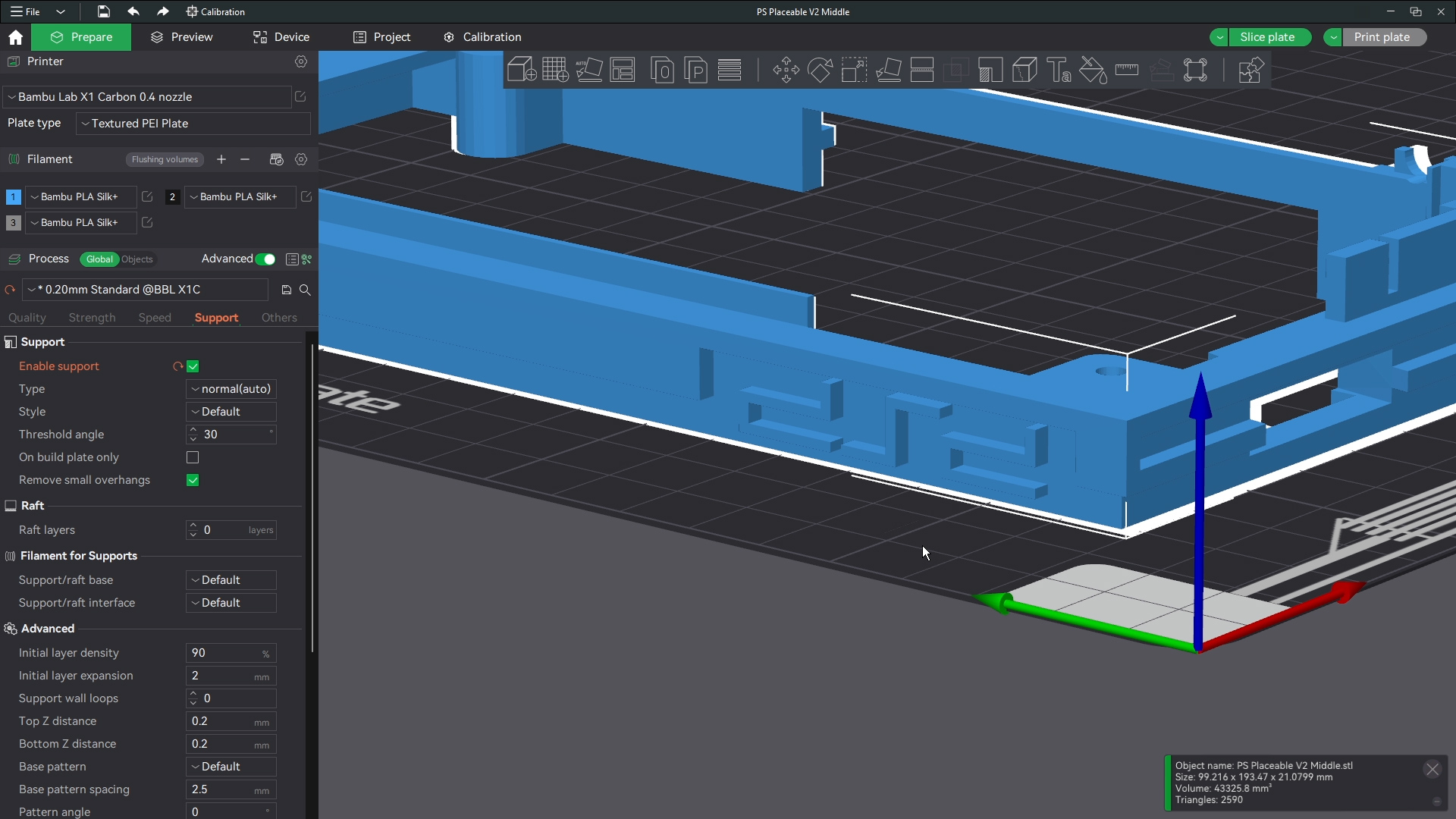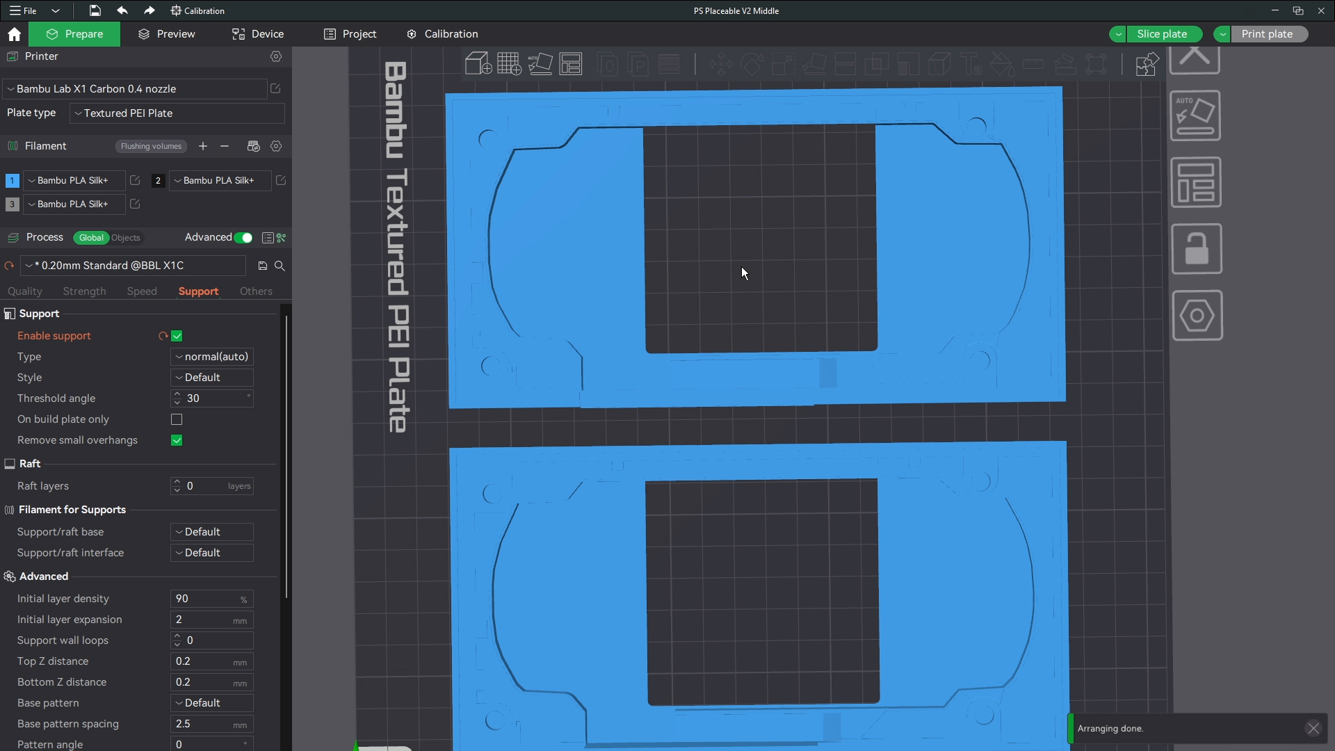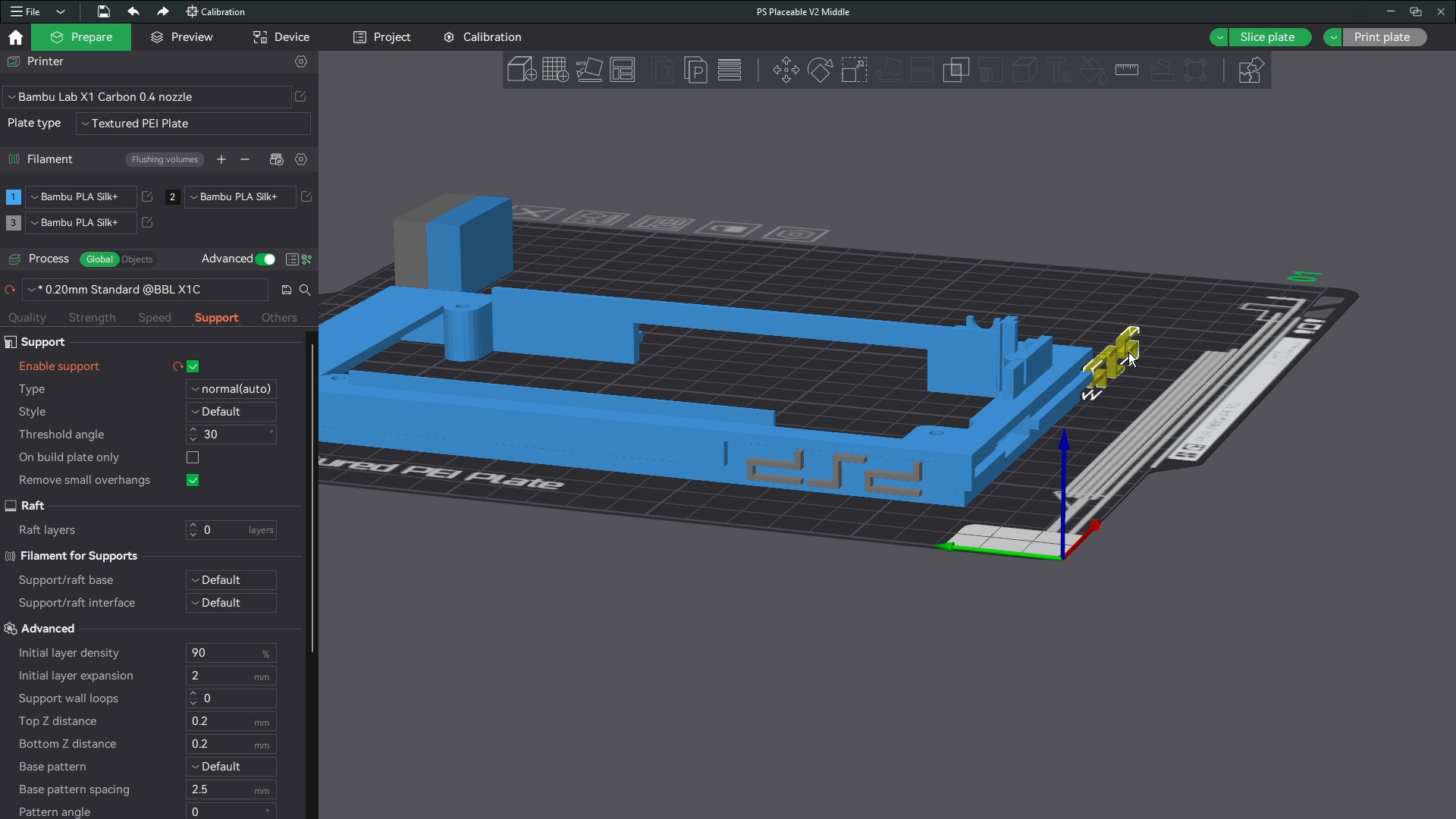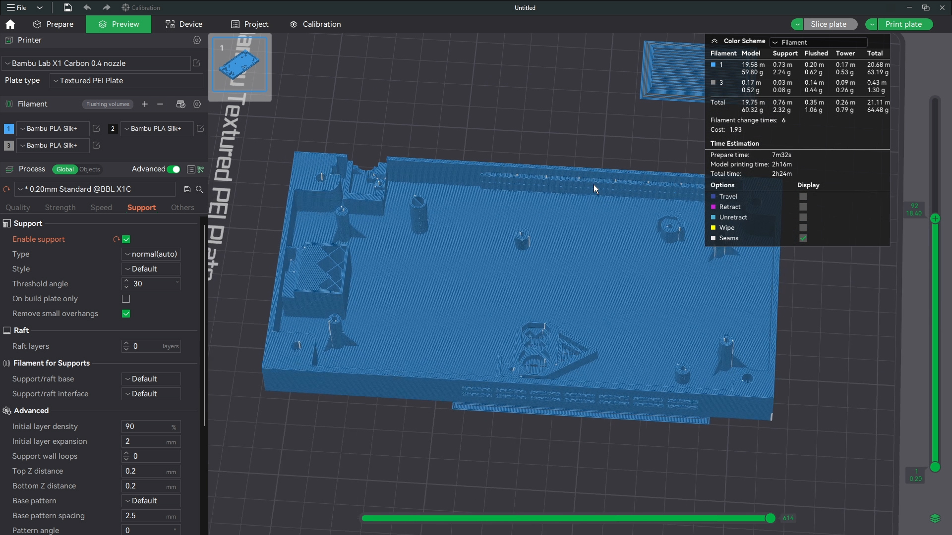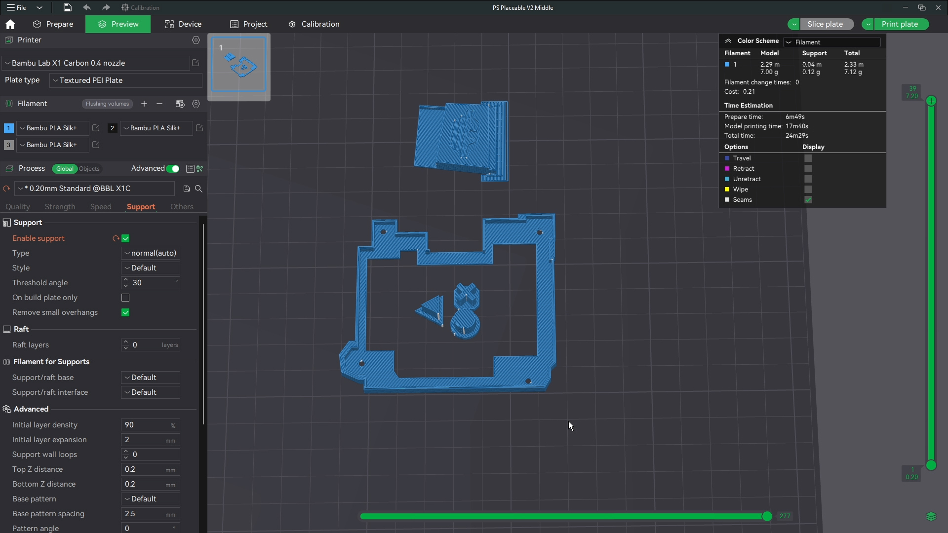 The printer shouldnt have an issue bridging these short gaps saving you the time from removing a ton of supports. Make sure though that the base and corners of the base have support around those parts where the buttons and screws will go. Then this is ready to print. I print all files with generic settings for which ever filament I am using and I use standard 0.2 mm settings for line height. All defaults in bambu studio.