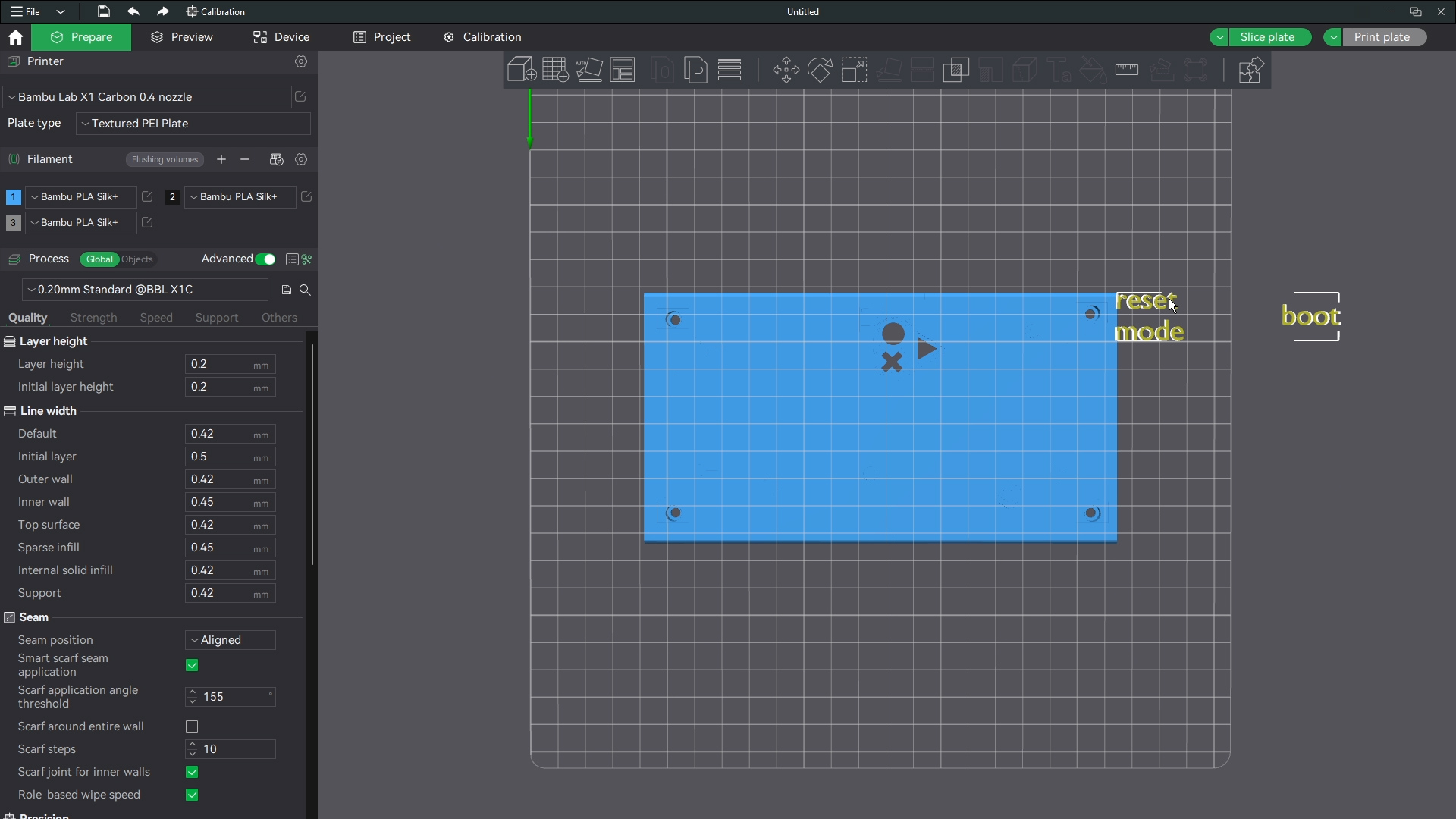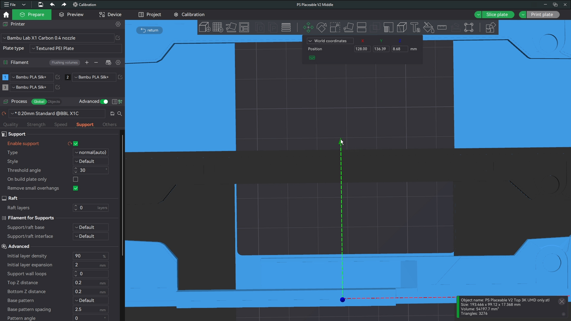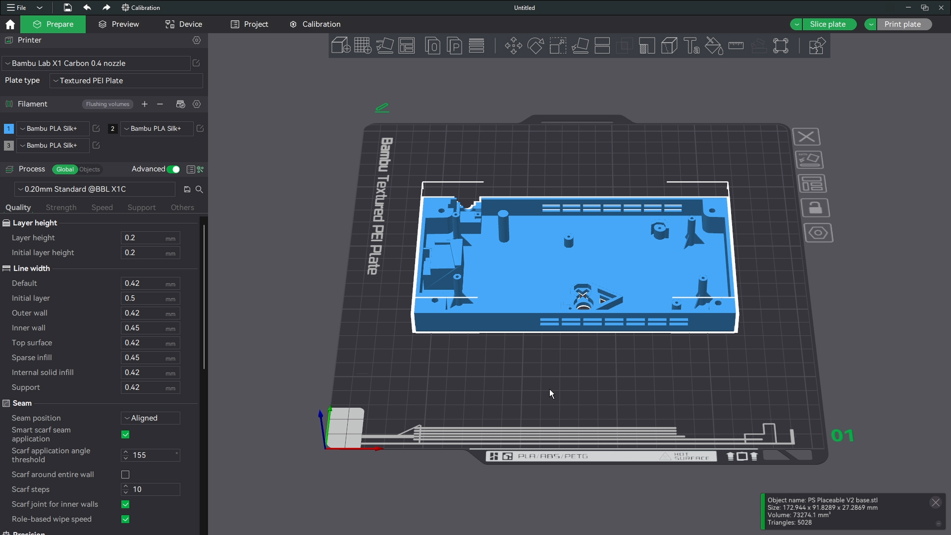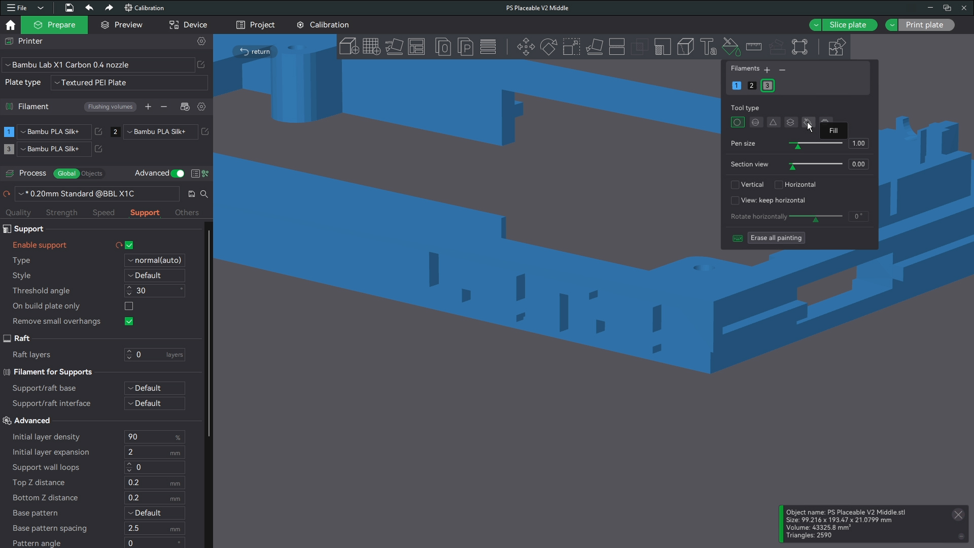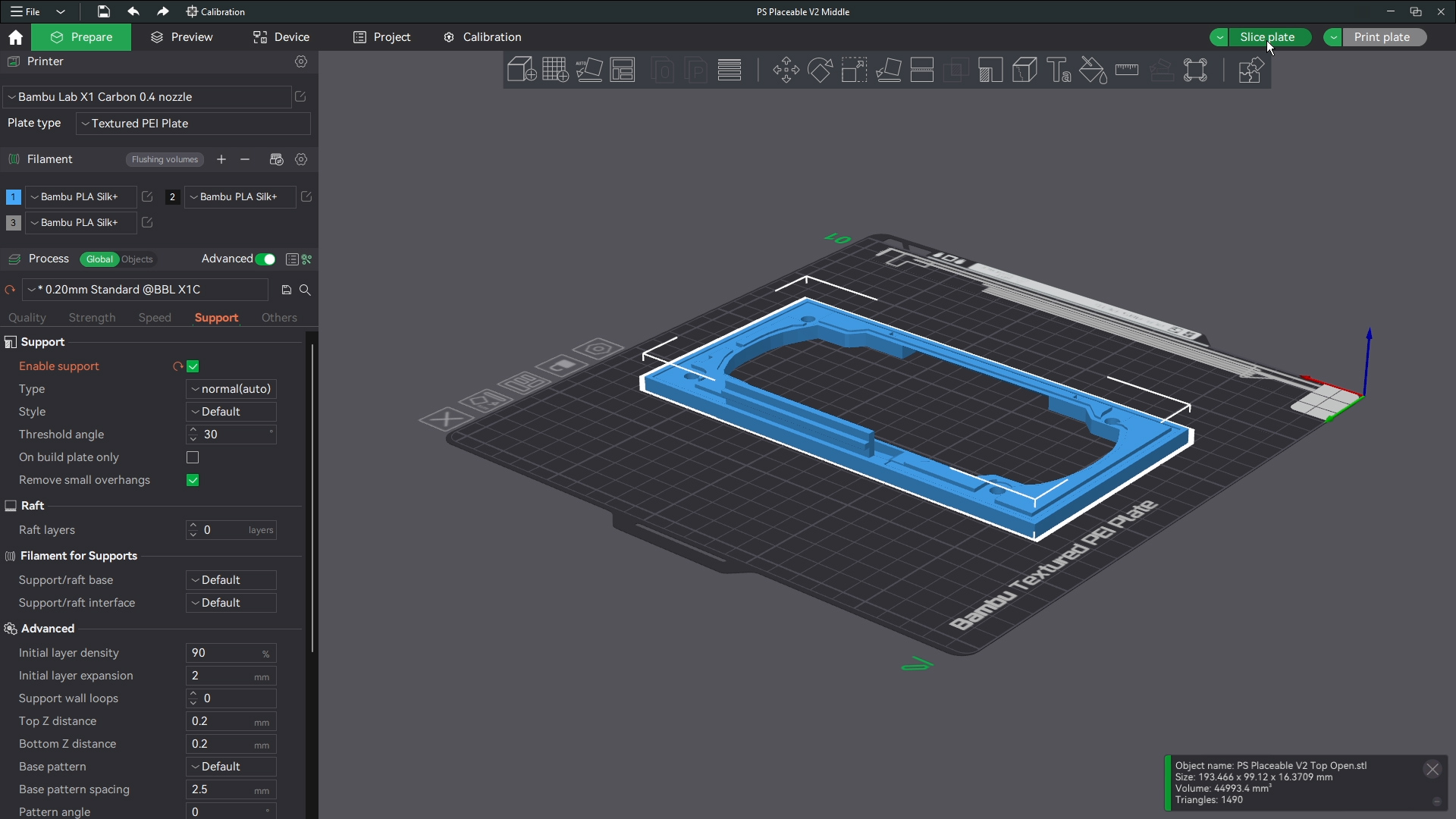 The printer shouldnt have an issue bridging these short gaps saving you the time from removing a ton of supports. Make sure though that the base and corners of the base have support around those parts where the buttons and screws will go. Then this is ready to print. I print all files with generic settings for which ever filament I am using and I use standard 0.2 mm settings for line height. All defaults in bambu studio.