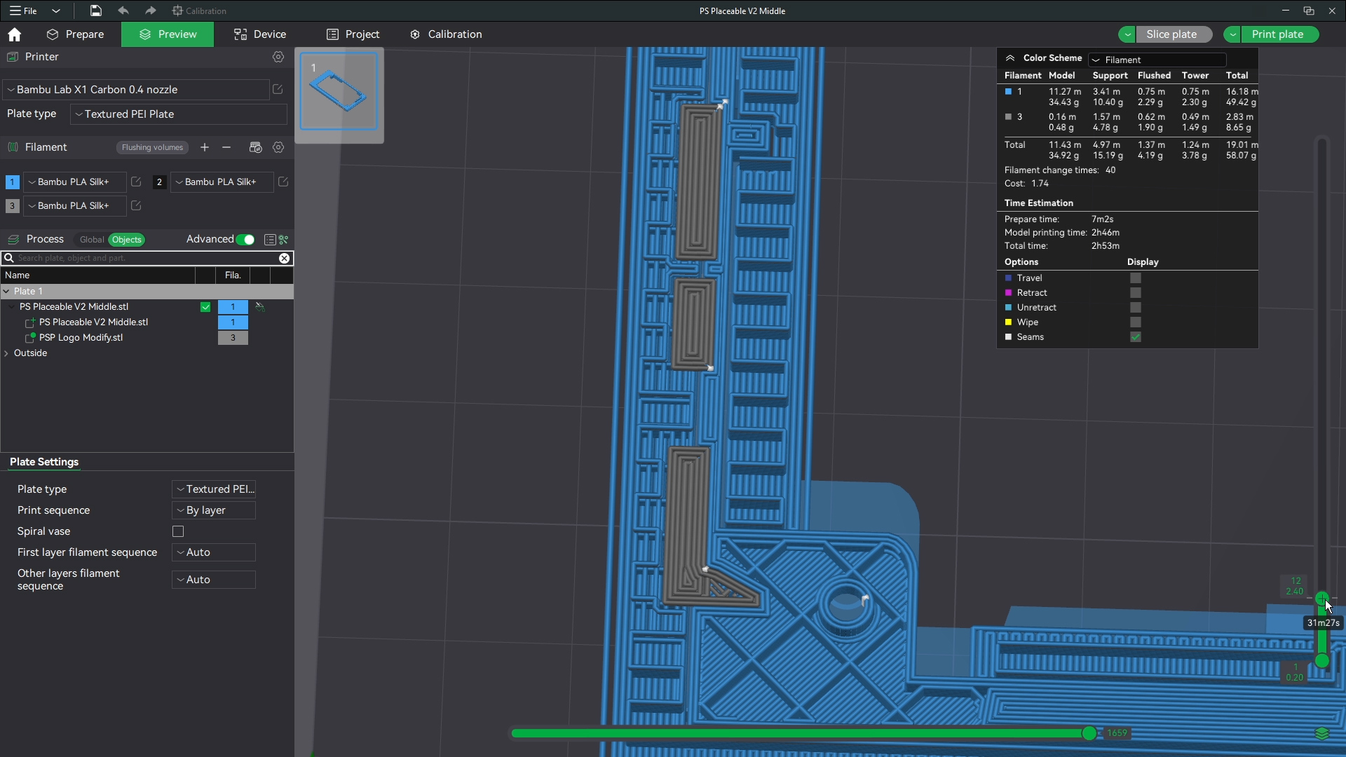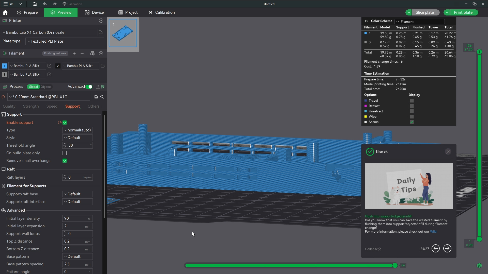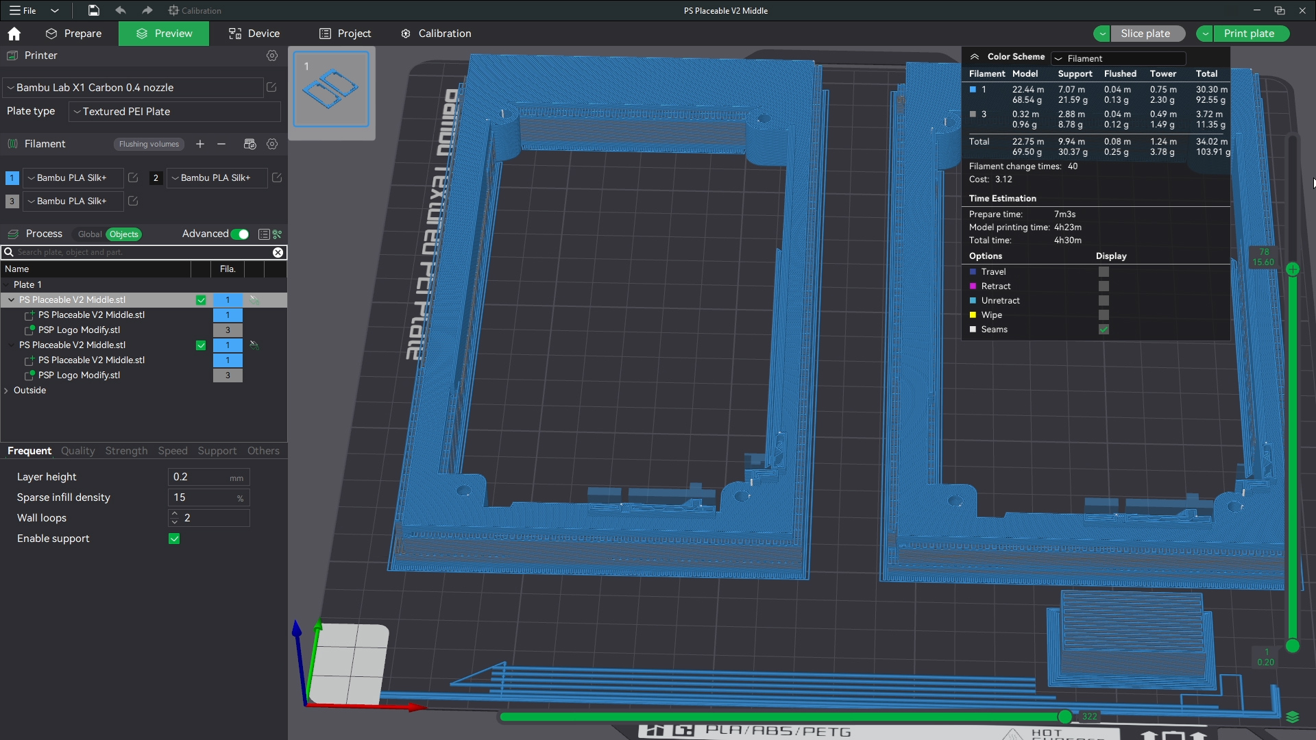 Now I print these in sets of two. You do not have to do that and in most cases wont need to I like to waste as little plastic as possible. There is no way to print the middle without supports. So that will always be a waste sadly. But we can flush our extra color to the supports. If you print two there is nearly zero waste. If you print one there will be about 4 grams of flushed plastic.