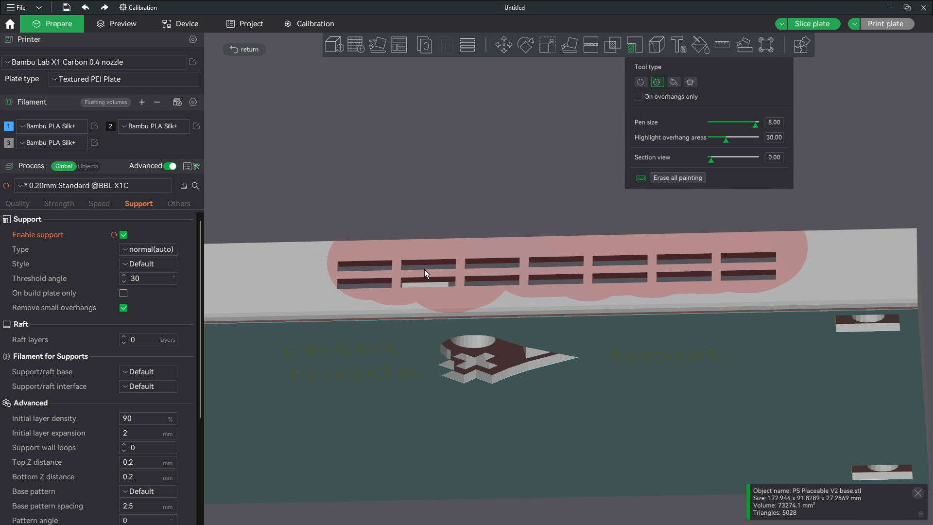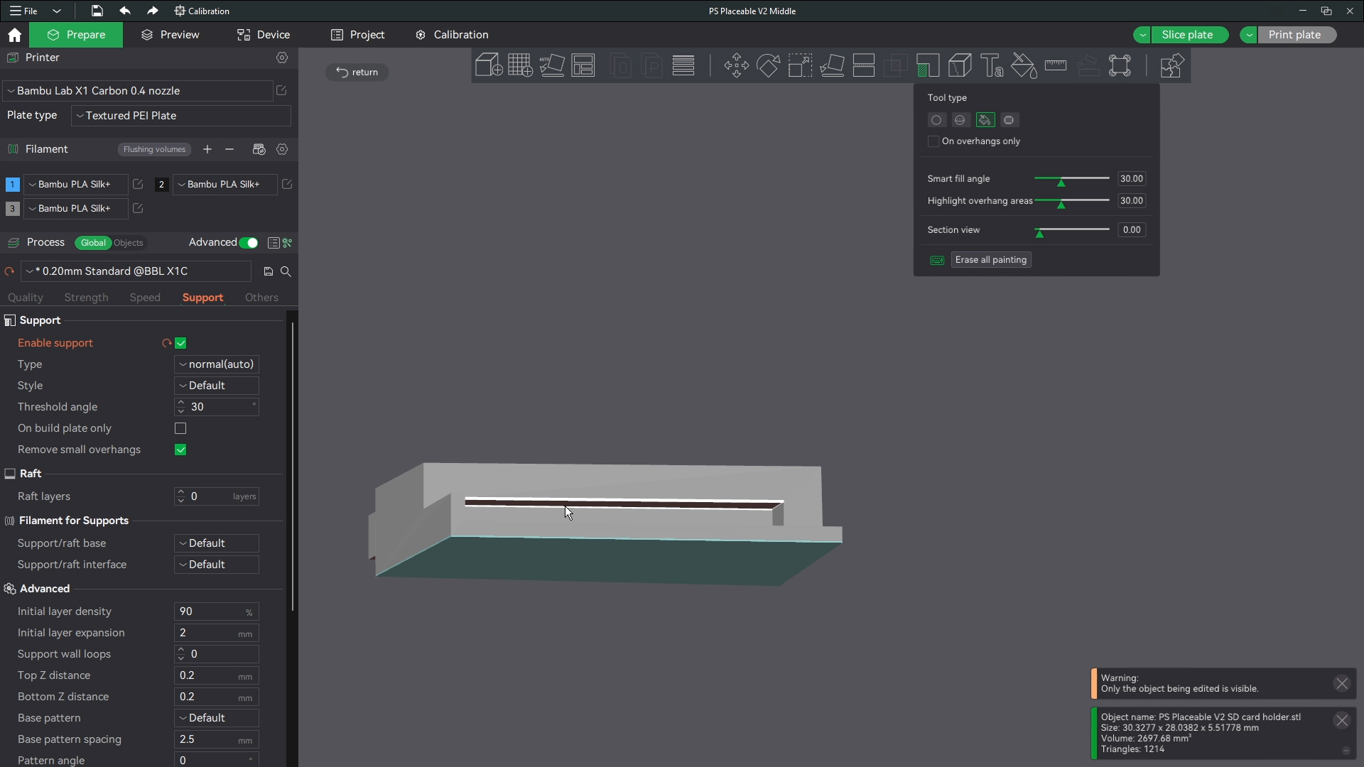 The spot where the memory card will be place needs to be bridged normally with no supports this lets the part form right and tight enough to hold the memory card. I use the edge painter here again to keep the middle from generating supports. Thats it you should have all the parts you need now for your build. Head over to the PSP disassembly guide for the next steps in the build process.