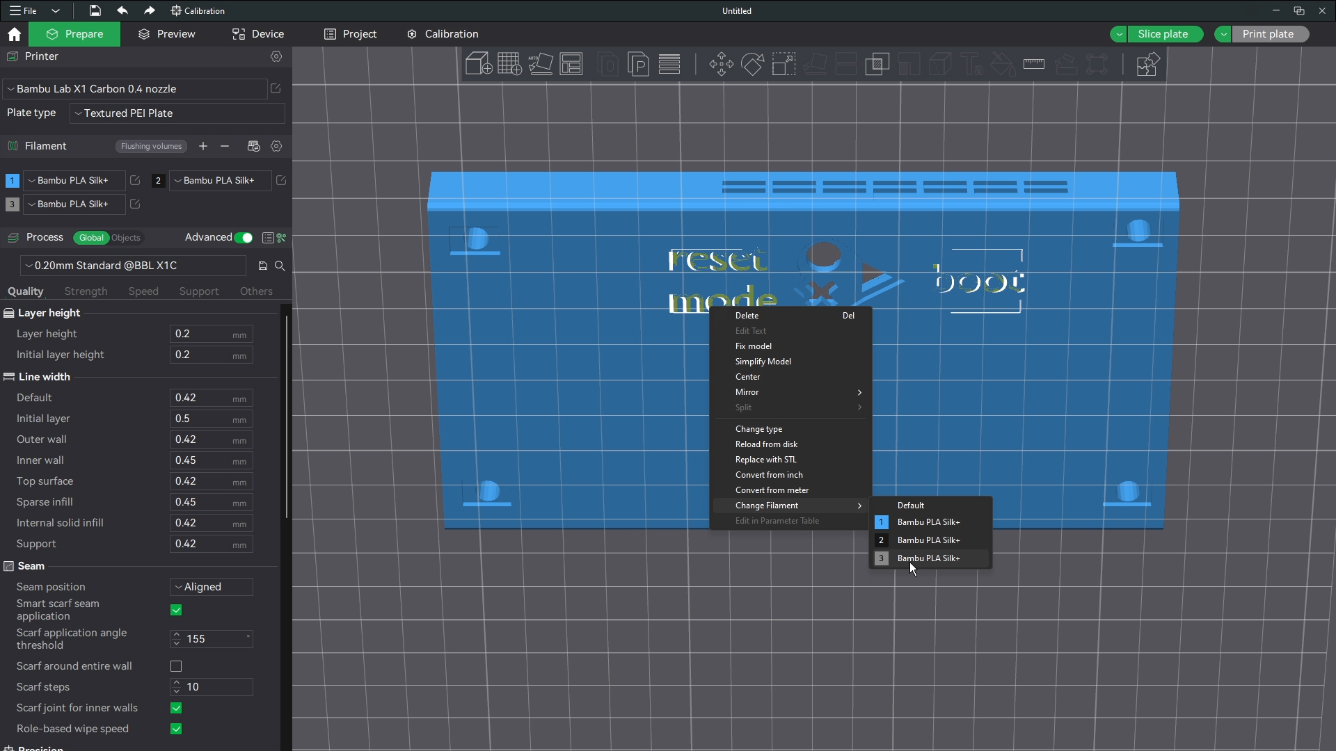 I print these as well as the middles with two colors of plastic I will walk you through how to do the same if your printer can do so. If not that is fine. For the base you can set up the words on the bottom to be a negative part. I will explain more in a later step.